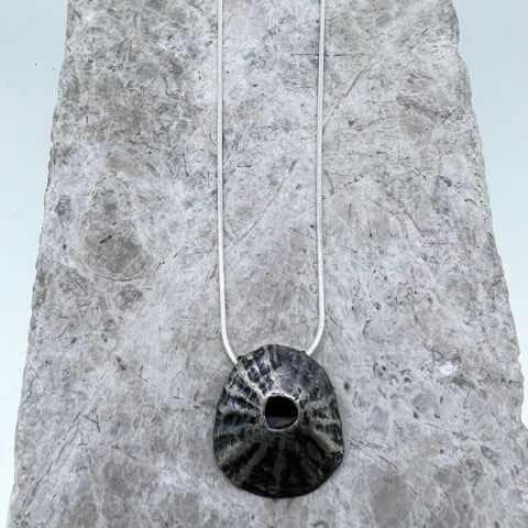 An sterling silver necklace handmade by Sharon McSwiney in St Ives, Cornwall. The limpet shell has been cast from an original shell found while beach combing at Mevagissey in Cornwall. The silver shell has been oxidised to give a darker finish which highlights the textures.