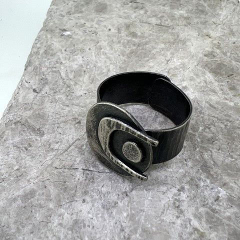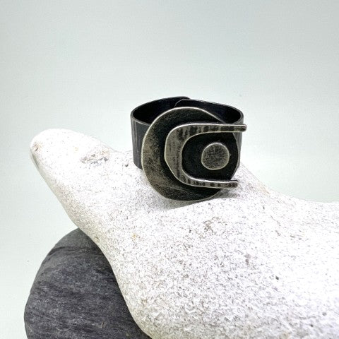 The motif has been cast in solid silver & given an oxidised finish which highlights the textures. The colouration is unique on each piece due to the nature of the application. The piece is lacquered to protect the surface & should require no cleaning. This ring is adjustable & be stretched open or closed to fit.