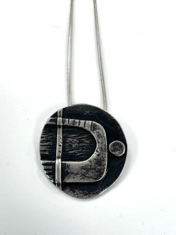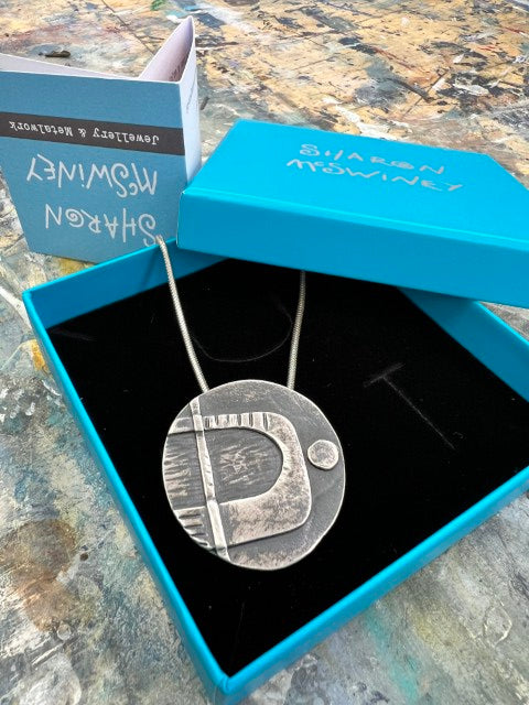 The piece has been cast in solid silver & decorated an oxidised finish which highlights the textured surfaces. The colouration is unique on each piece due to the nature of the application. The pendant is lacquered to protect the surface & should require no cleaning.