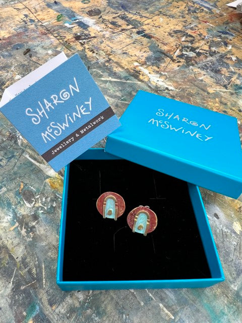 The motifs have been cast in solid brass & decorated with flux, heat & a verdigris effect. The colouration is unique on each piece due to the nature of the application. The pieces are lacquered to protect the surface & should require no cleaning. These stud earrings are supplied with sterling silver findings.