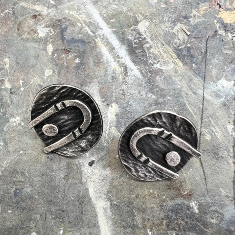 The motifs have been cast in solid silver & given an oxidised finish to highlight the textures. The colouration is unique on each piece due to the nature of the application. The pieces are lacquered to protect the surface & should require no cleaning. These stud earrings are supplied with sterling silver posts & butterflies. The earrings have been hallmarked.