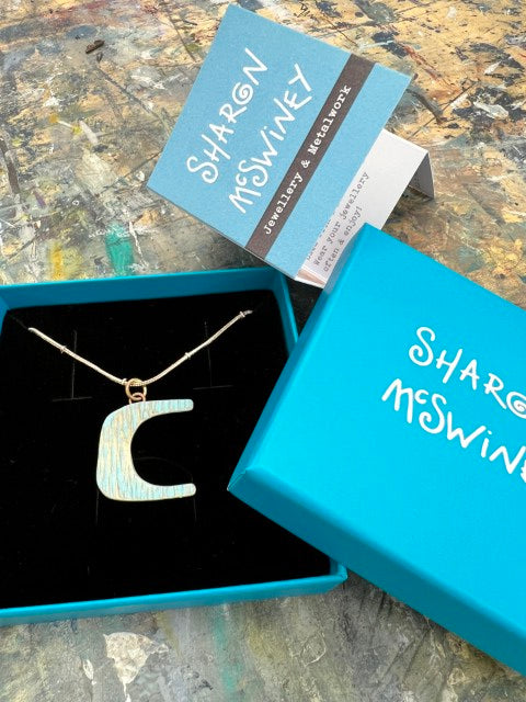 Unusual textured metal pendant necklace handmade by Sharon McSwiney. The design is inspired by Troika Pottery & the sculpture of Barbara Hepworth both with very strong links with St Ives.