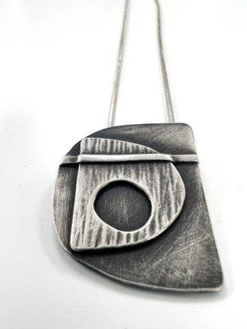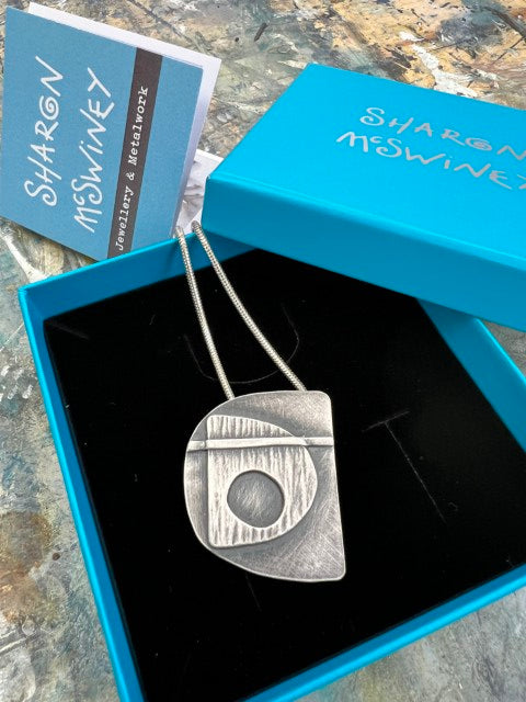 An unusual statement pendant handmade by Sharon McSwiney.  The design is inspired by Troika Pottery & the sculpture of Barbara Hepworth both with very strong links with St Ives.