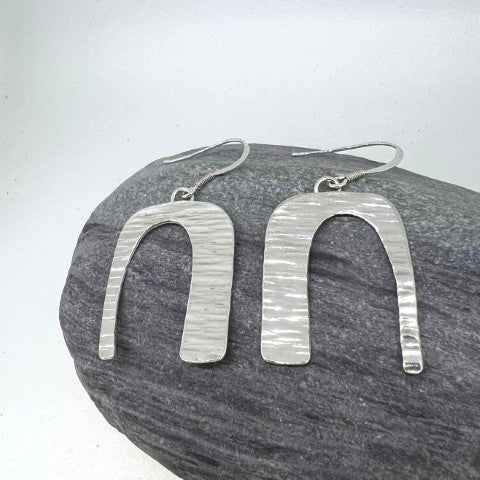 The motifs have been cast in solid silver & hammered to create the surface effect. These drop earrings are supplied with sterling silver earring hooks.